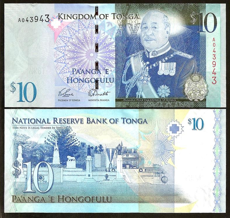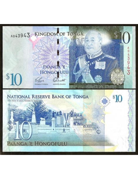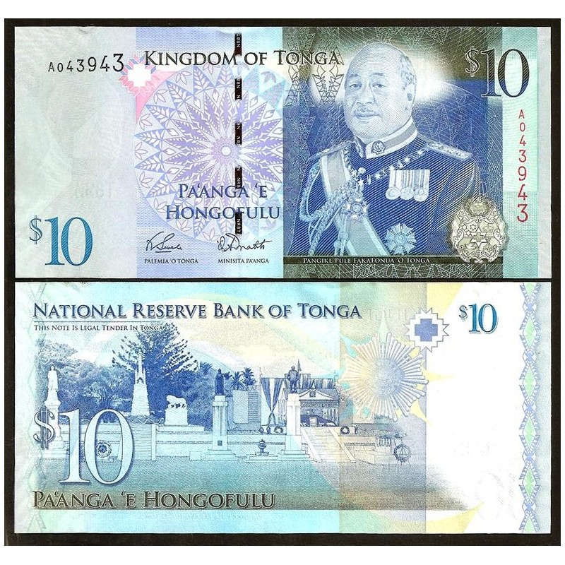 Portrait of King Siaosi (George) Tupou V in ceremonial attire, with the national coat of arms of Tonga and traditional ornamental motifs.
