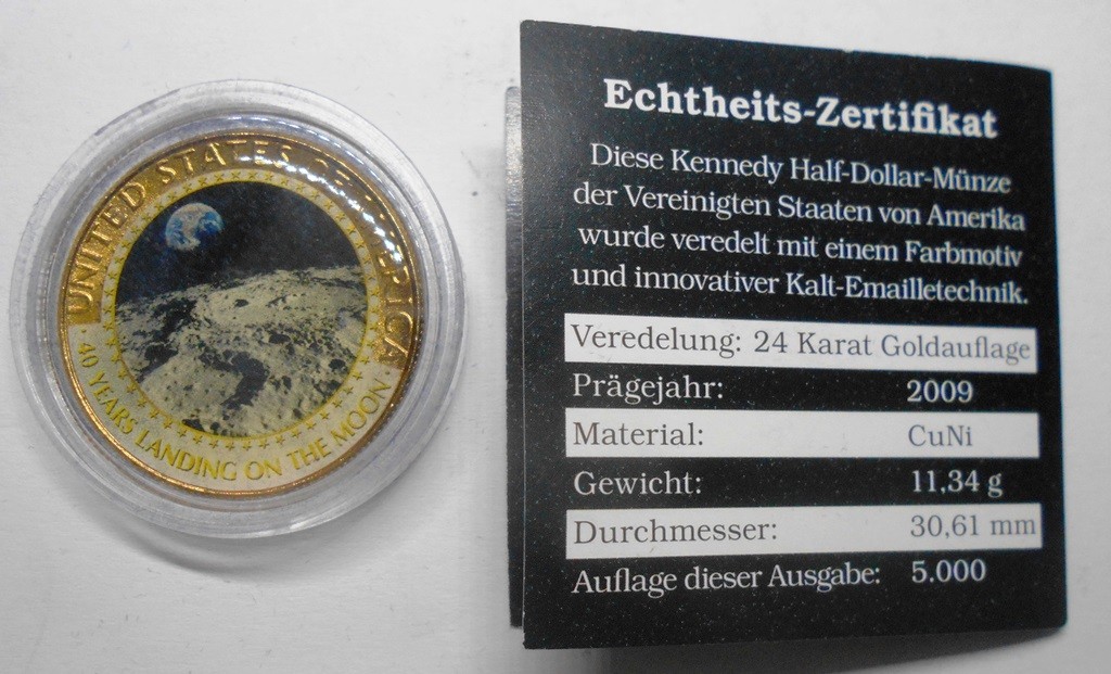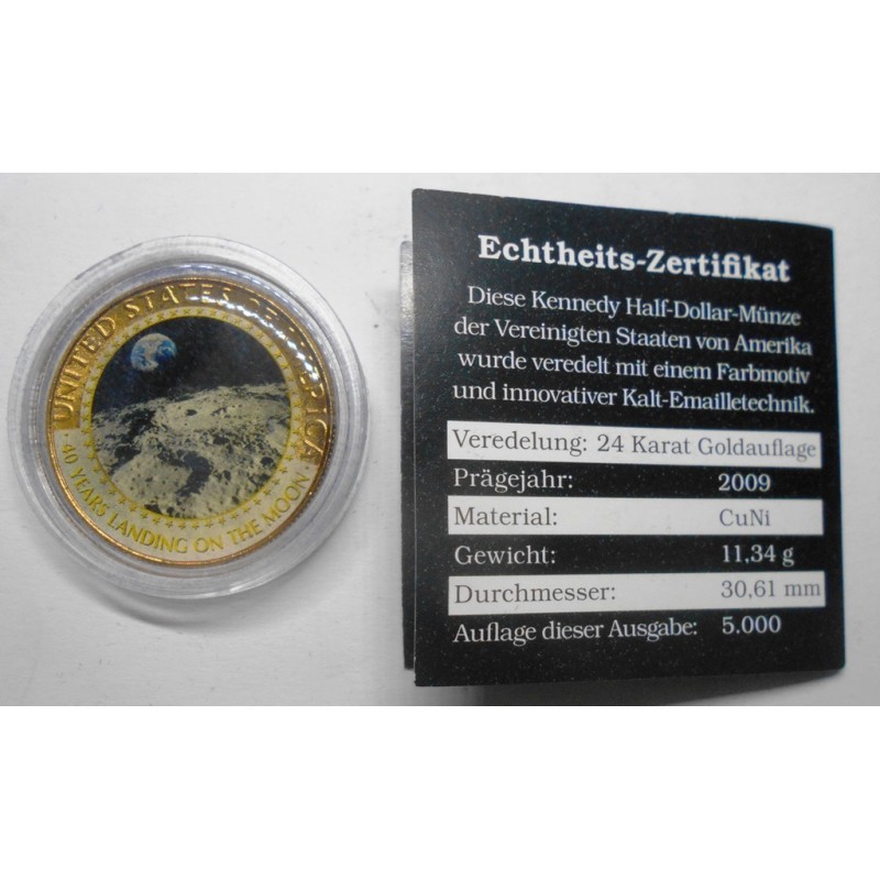 USA Half Dollar Kennedy w. 40 Years Landing on the Moon 24K Placcato Oro