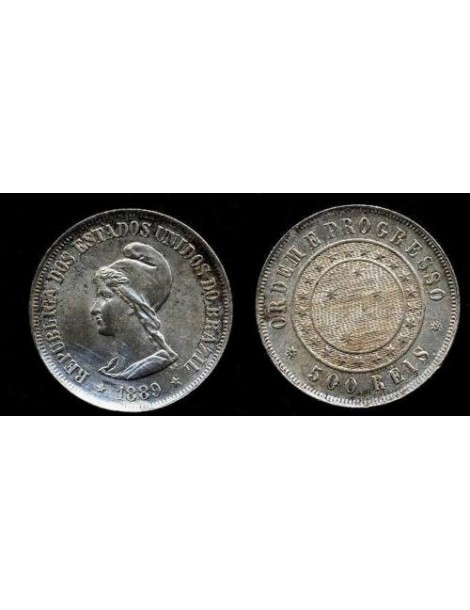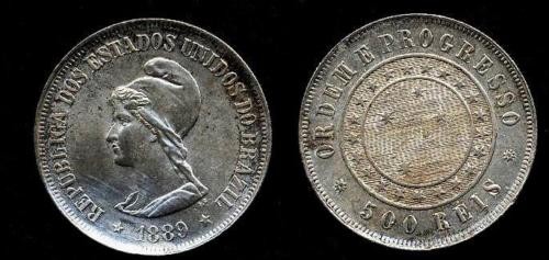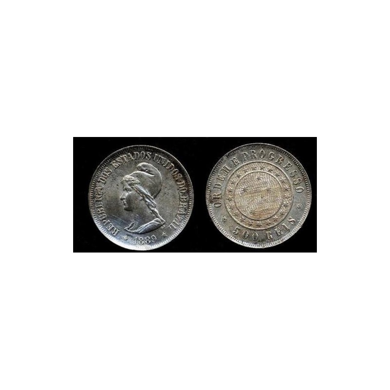 BRAZIL 500 Reis 1889 AG Liberty