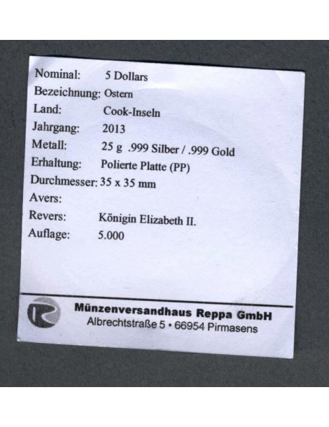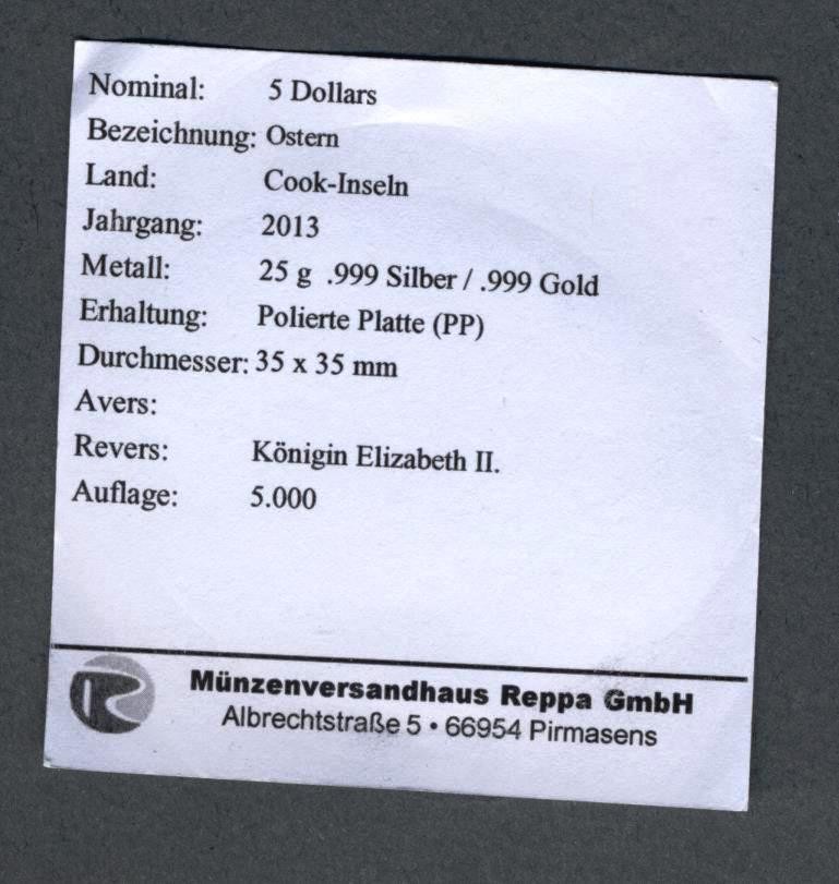 COOK ISLANDS 5 Dollars 2013 Pasqua AG/AU PROOF