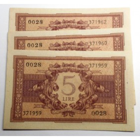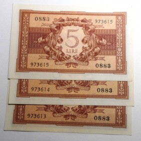 5 Lire 1944 Luogotenenza Ventura/Simoneschi /Giovinco n. 3 banconote da mazzetta FDS