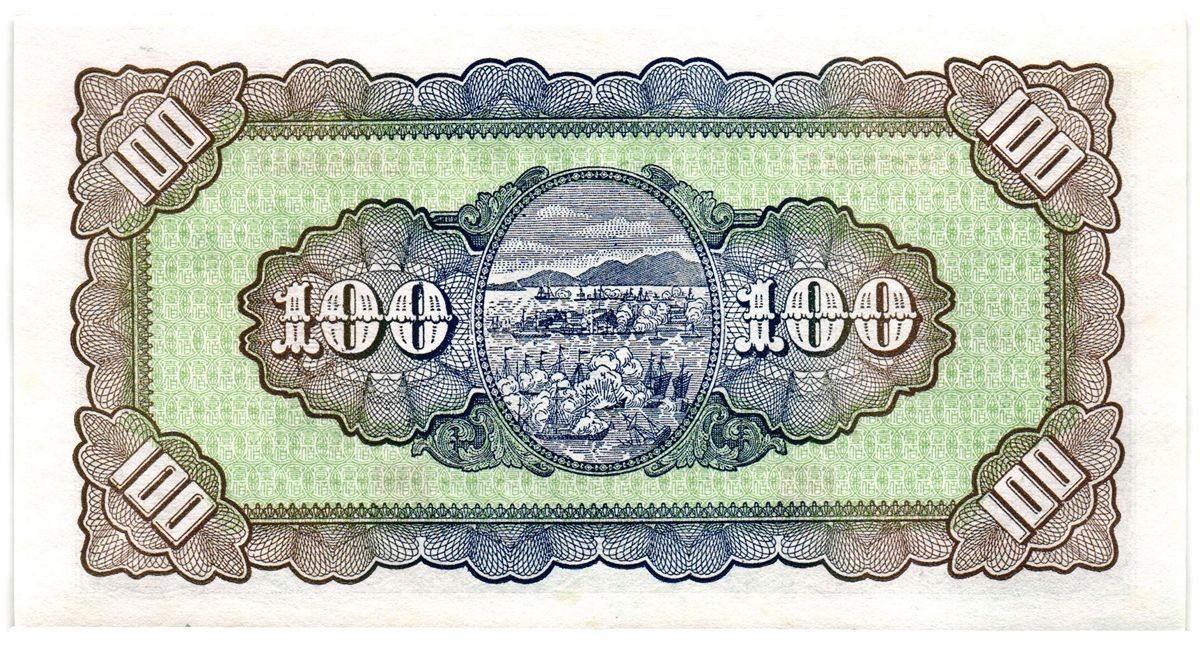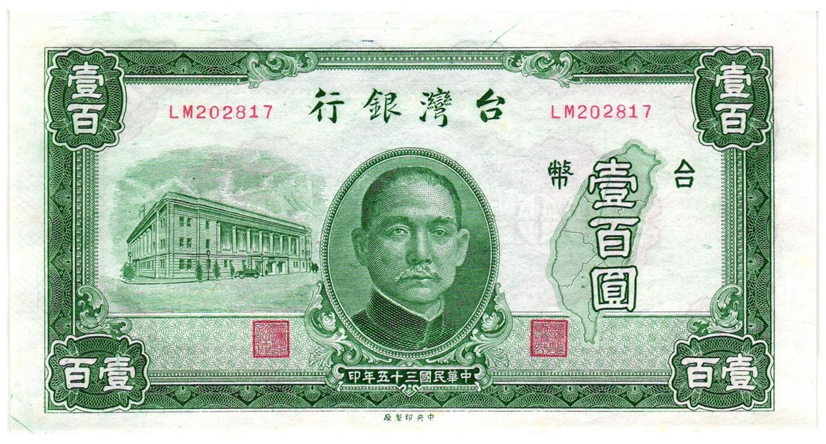 Il fronte presenta il ritratto di Dr. Sun Yat-sen, figura centrale della storia moderna cinese. Accanto al ritratto è rappresentato il Bank of Taiwan building di Taipei, edificio istituzionale raffigurato con impostazione architettonica formale. Sullo sfondo compare inoltre il profilo geografico dell’isola di Taiwan, integrato come elemento simbolico dell’identità nazionale.