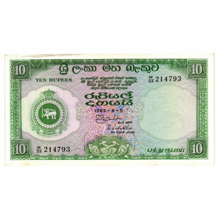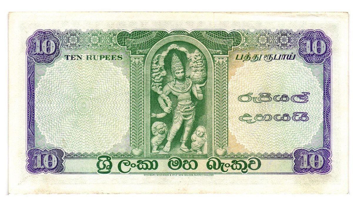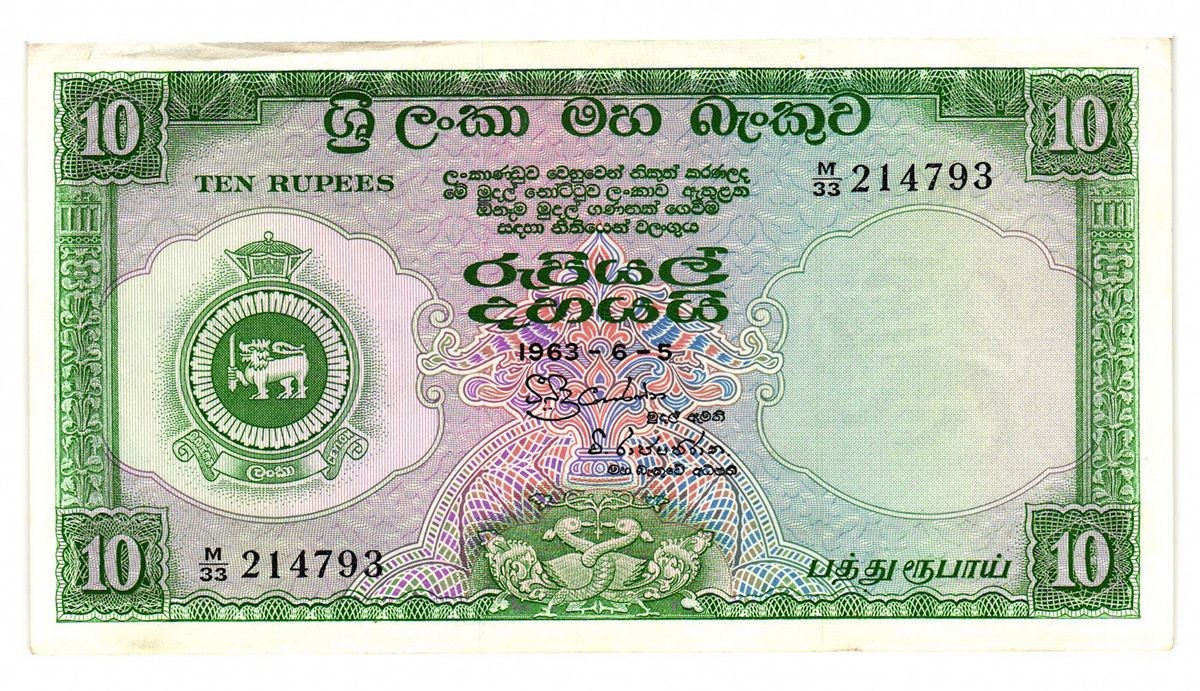 Stemma nazionale di Ceylon al centro, con motivi ornamentali classici e valore nominale.