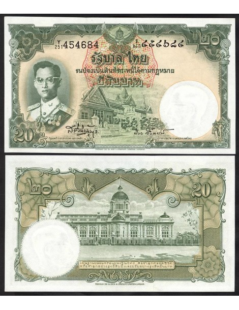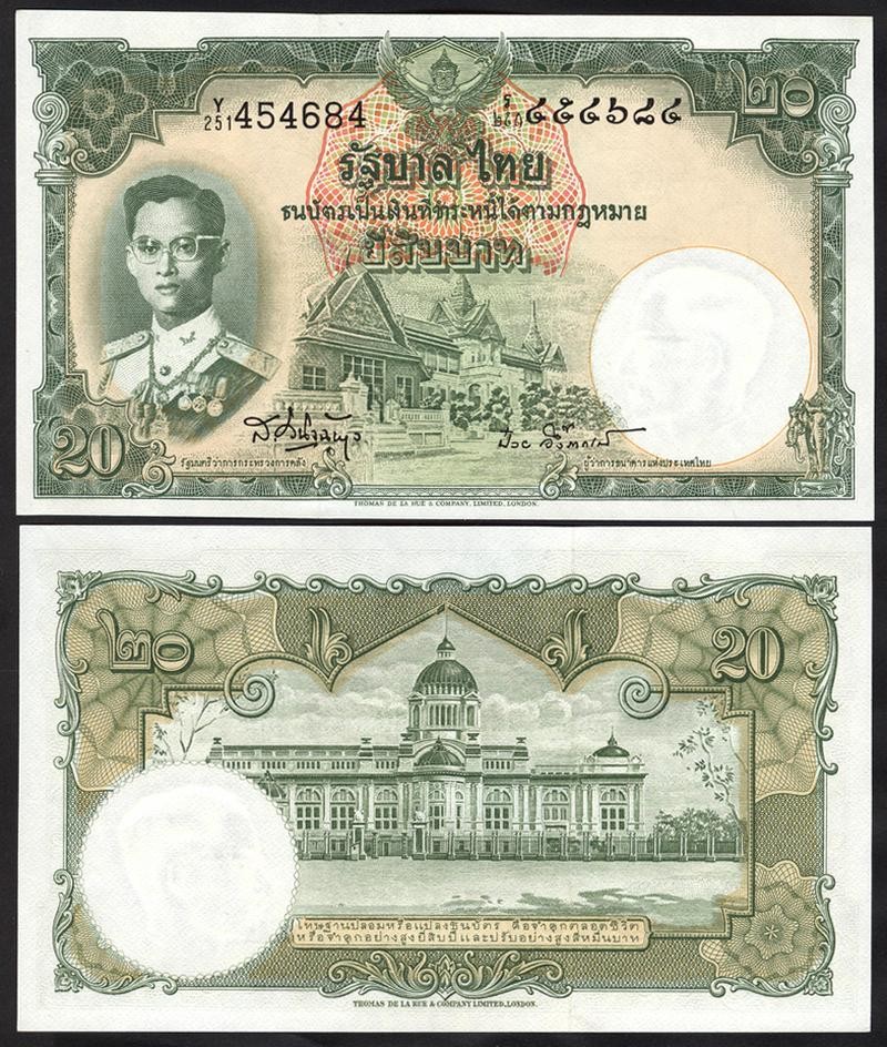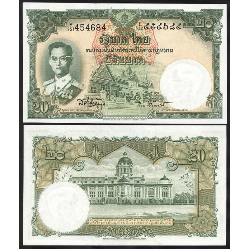 Il fronte presenta il ritratto di Bhumibol Adulyadej (Rama IX), rappresentato in posizione centrale con un’impostazione formale che ne evidenzia il ruolo istituzionale. La scena è incorniciata da elementi decorativi che completano la composizione.