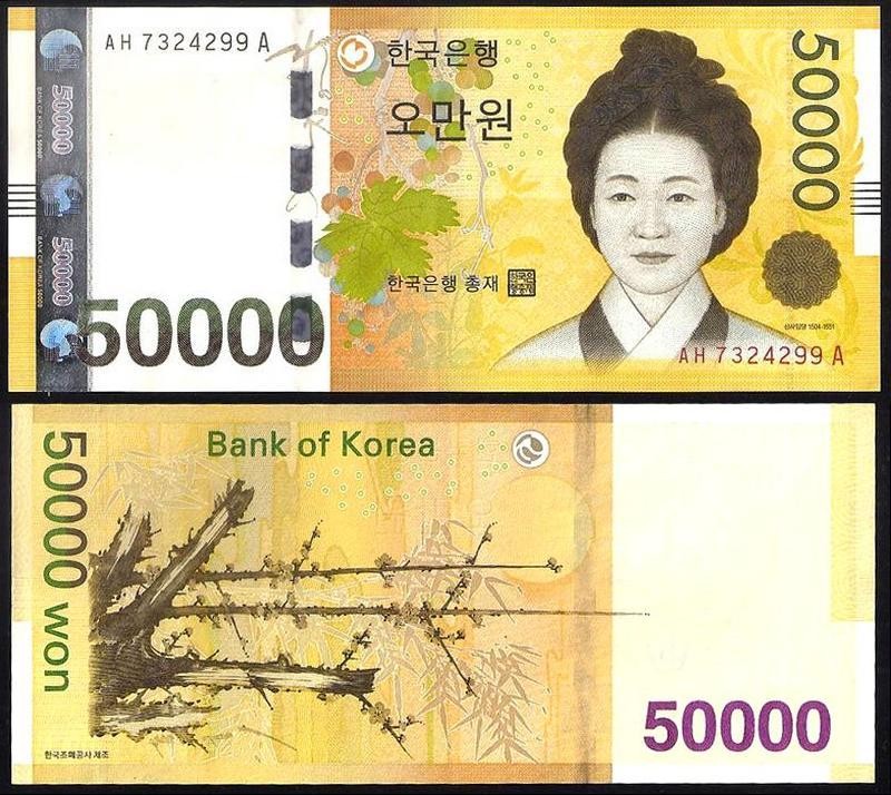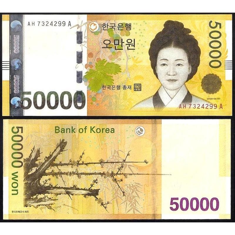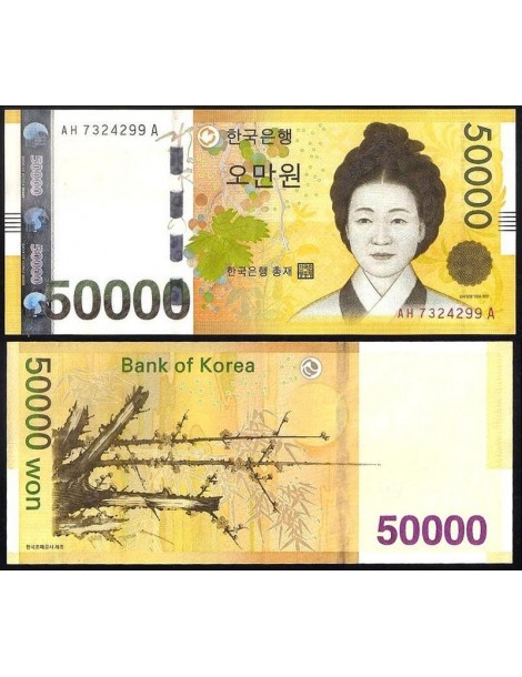 In alto è presente la scritta “Bank of Korea” in coreano, mentre la denominazione 50000 compare sul lato sinistro.