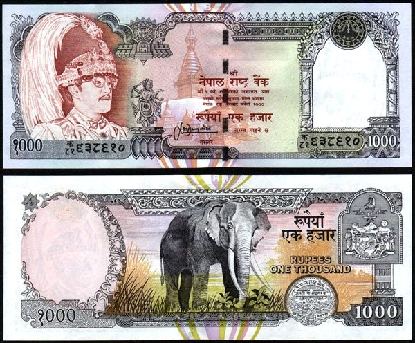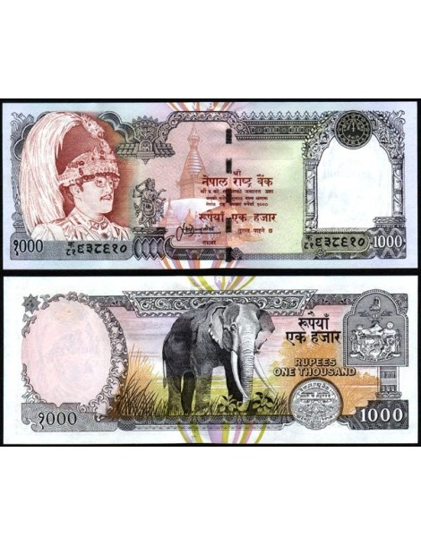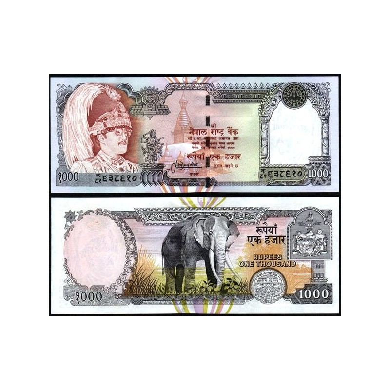 Il fronte presenta il ritratto di Birendra Bir Bikram Shah Dev, raffigurato con un copricapo cerimoniale piumato, reso con uno stile formale e solenne. Accanto al ritratto è rappresentato un complesso religioso con stupa, elemento iconografico distintivo dell’architettura nepalese.