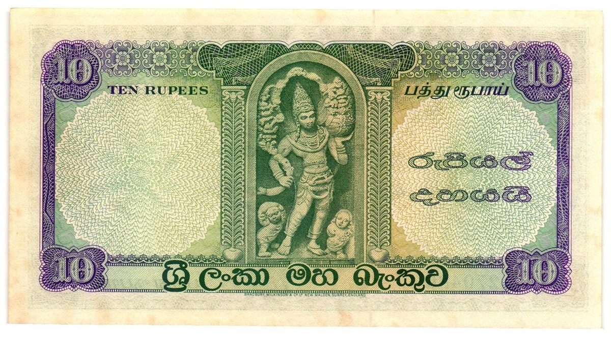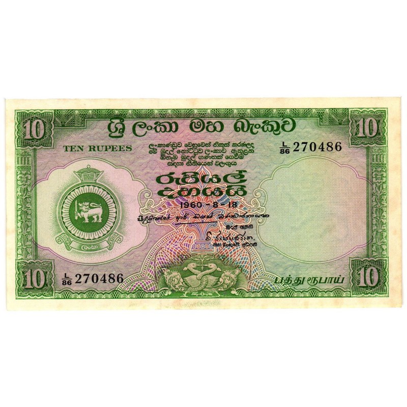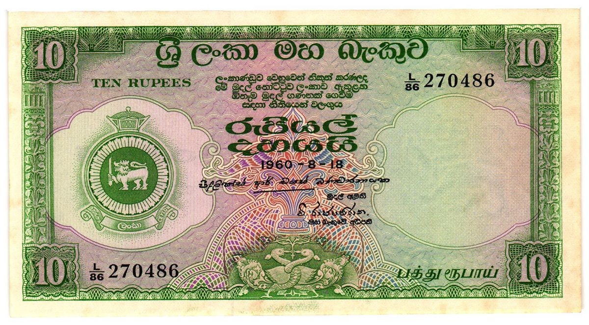Stemma nazionale di Ceylon al centro, con motivi ornamentali classici e valore nominale.