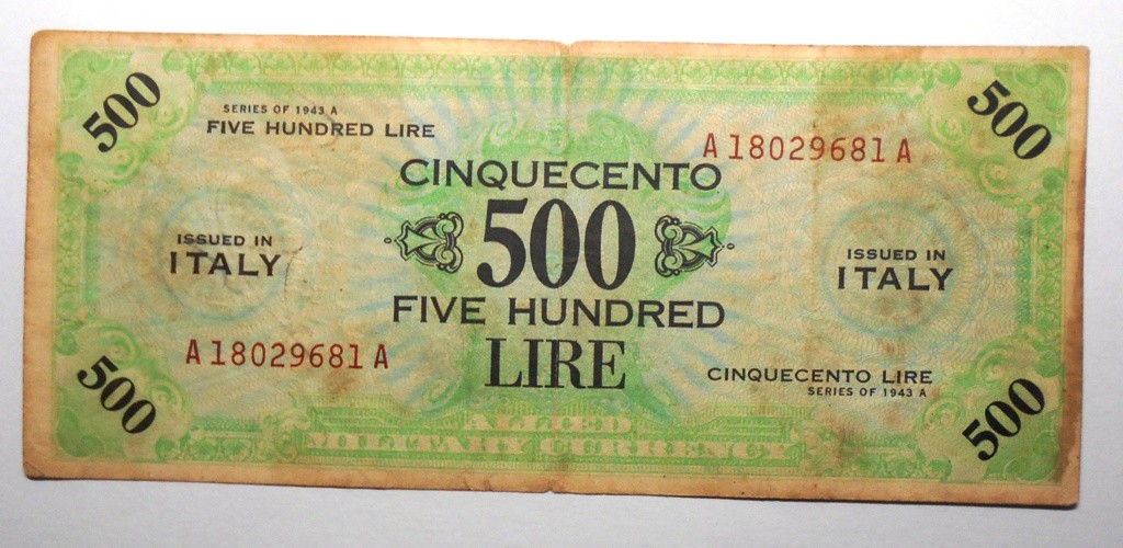 500 AM Lire BILINGUE 1943 OCCUPAZIONE AMERICANA