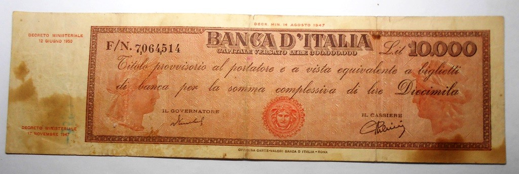 10.000 Lire TITOLO PROVVISORIO 12.6.1950