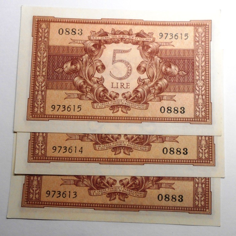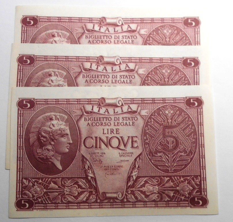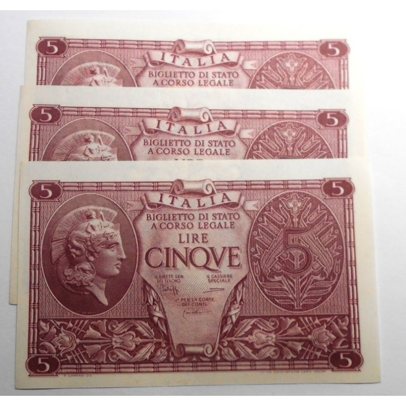 5 Lire 1944 Luogotenenza Bolaffi /Cavallaro /Giovinco n.3 Banconote da mazzetta FDS