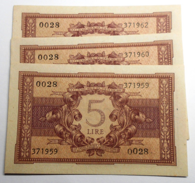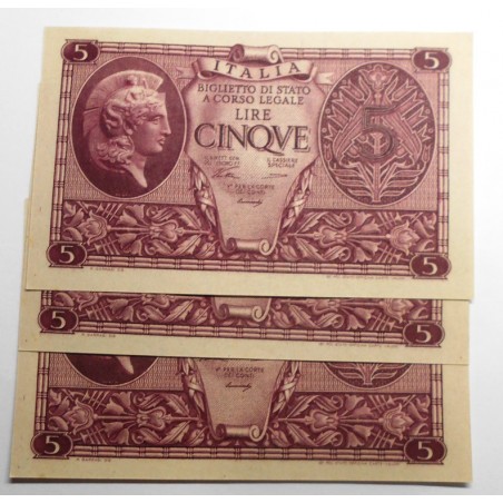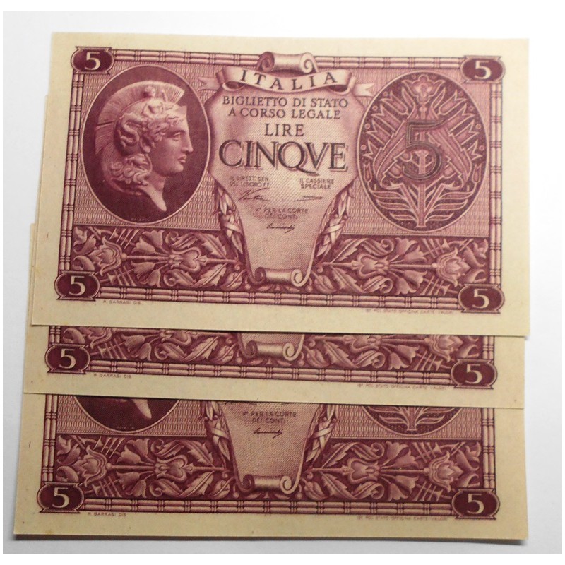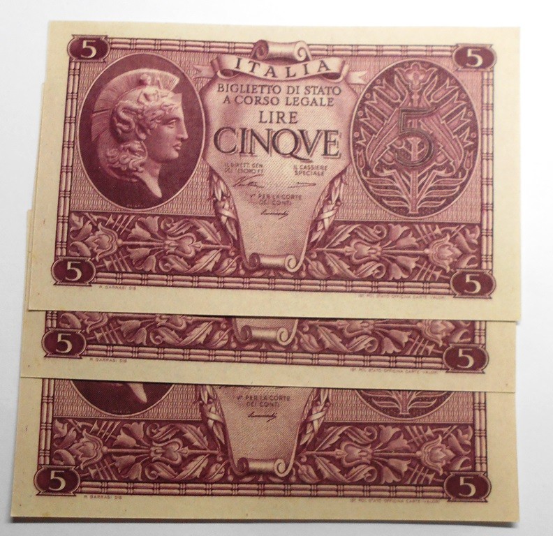 5 Lire 1944 Luogotenenza Ventura/Simoneschi /Giovinco n. 3 banconote da mazzetta FDS