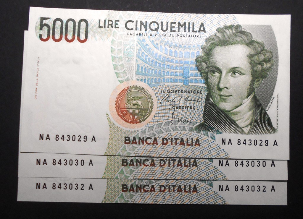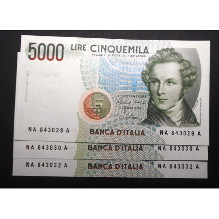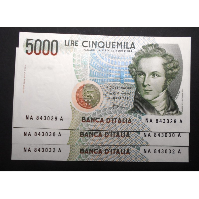 n.5000 Lire Bellini 1985 Lettera A n. 3 banconote da mazzetta FDS