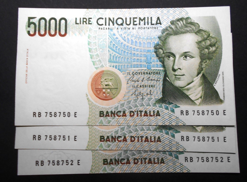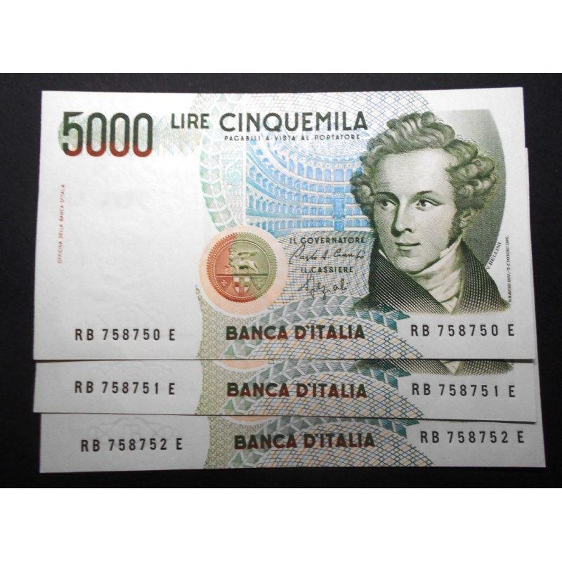 5000 Lire Bellini 1985 Lettera B n. 3 banconote da mazzetta FDS