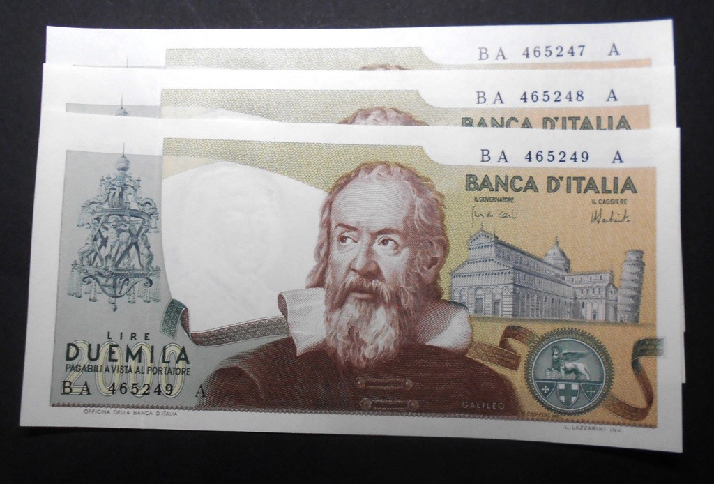 2000 Lire Galileo 1973 n. 3 banconote da mazzetta FDS