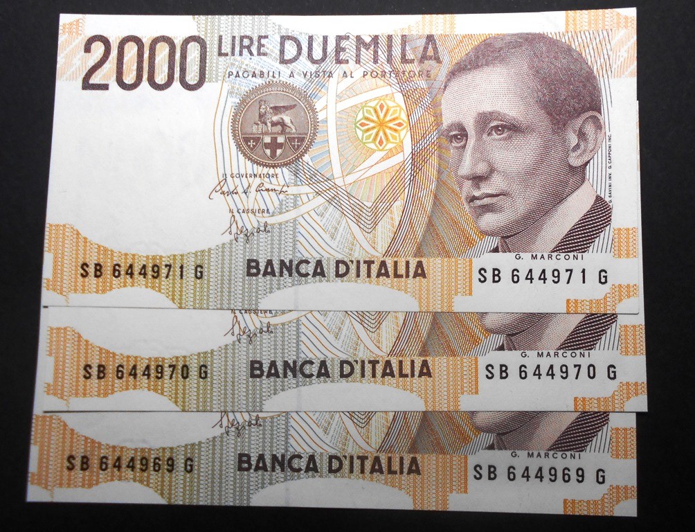 2000 Lire 1990 Marconi Lettera B n. 3 banconote da mazzetta FDS