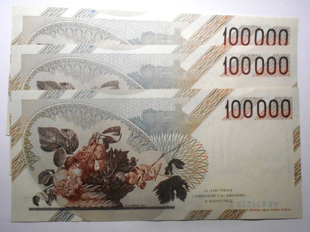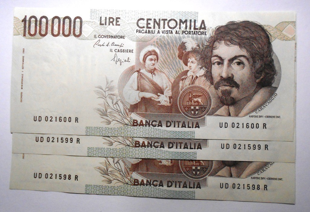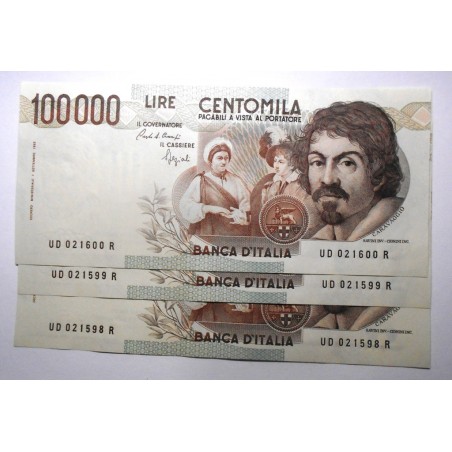 100.000 Lire Caravaggio 1° Tipo Lett. D Lotto n.3 banconote da mazzetta FDS
