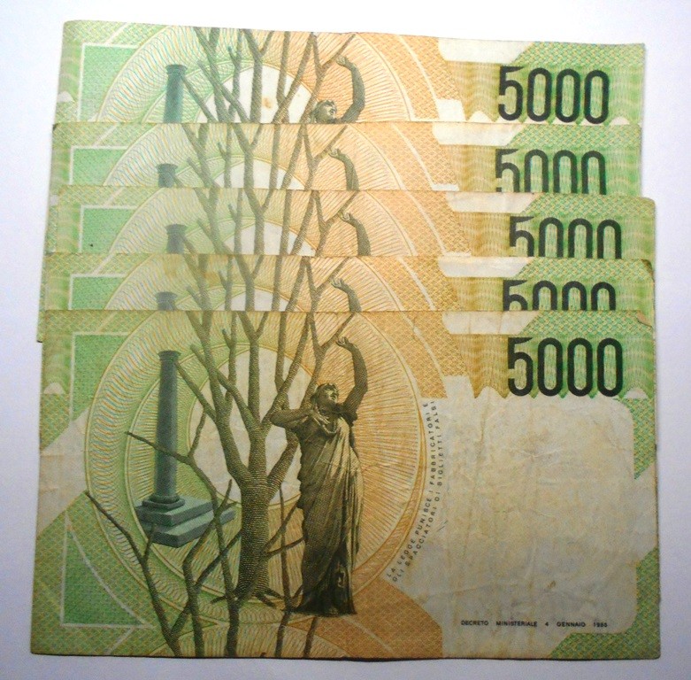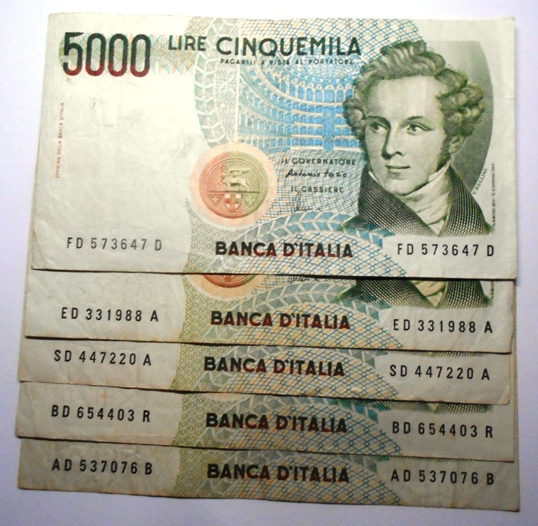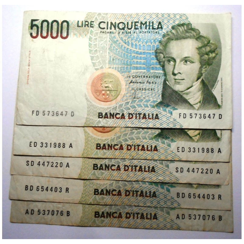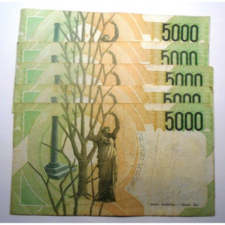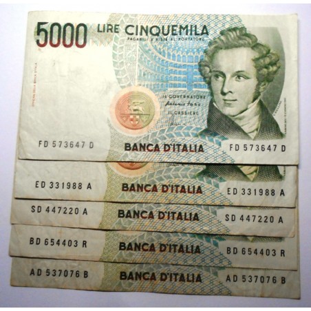 5000 Lire Bellini 1985 (1996) Lotto n.5 banconote Lettera D