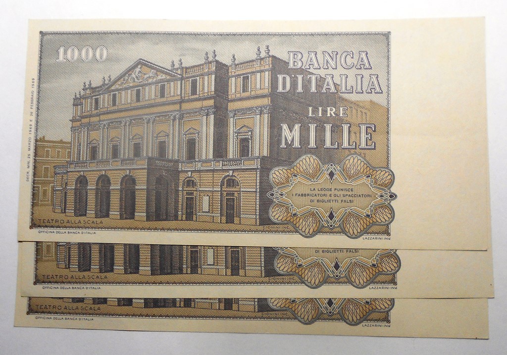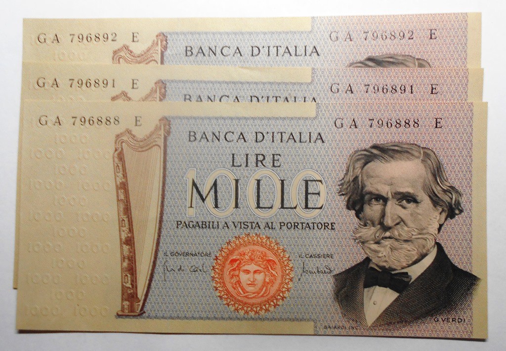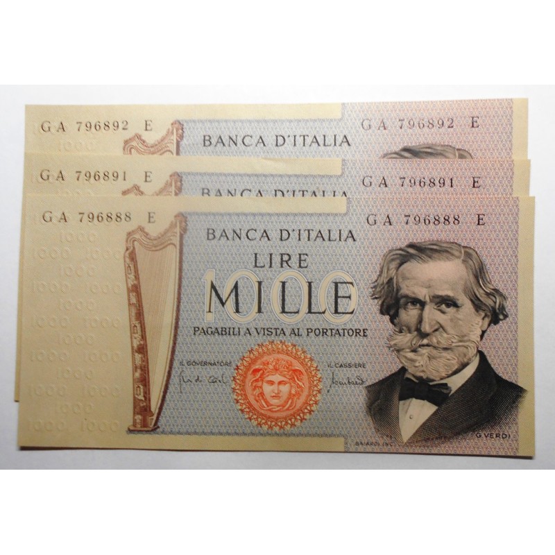 1000 Lire Verdi 1969 n.3 banconote da mazzetta