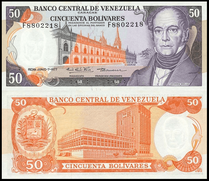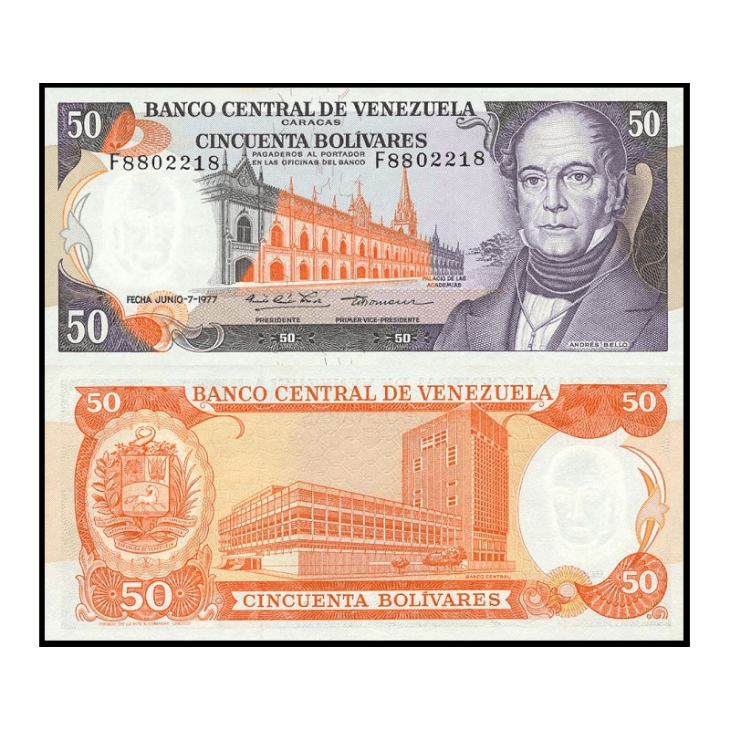 Il fronte presenta il ritratto di Andrés Bello, figura centrale della cultura e della formazione linguistica e letteraria latinoamericana. Accanto al ritratto è raffigurato il Palace of the Academies di Caracas, edificio di grande valore storico e accademico, rappresentato con impostazione formale e simmetrica.