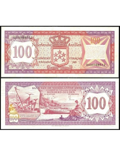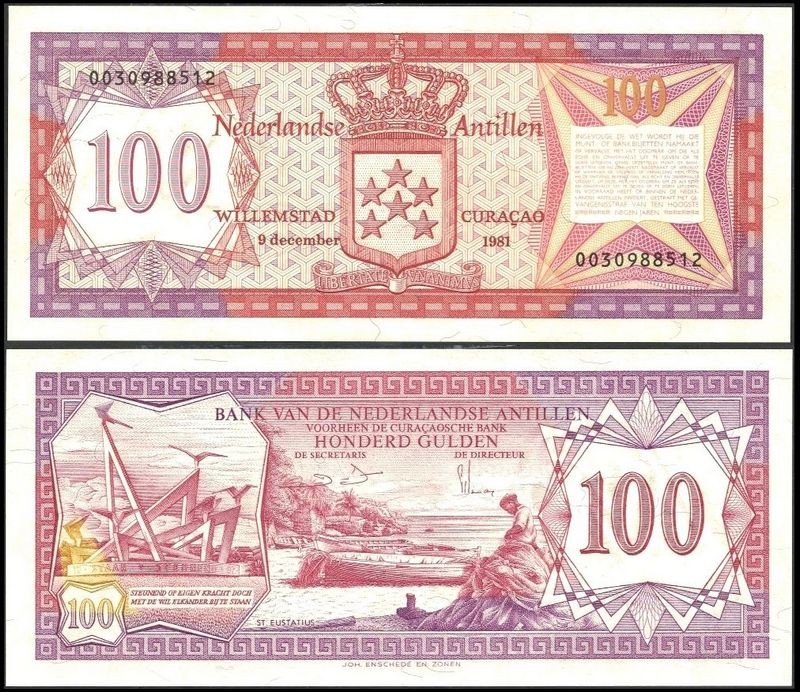 Il retro presenta lo stemma delle Antille Olandesi, reso con un linguaggio araldico formale e istituzionale. L’emblema sintetizza l’unità amministrativa dell’arcipelago e il legame storico con i Paesi Bassi, conferendo alla composizione un forte carattere ufficiale.