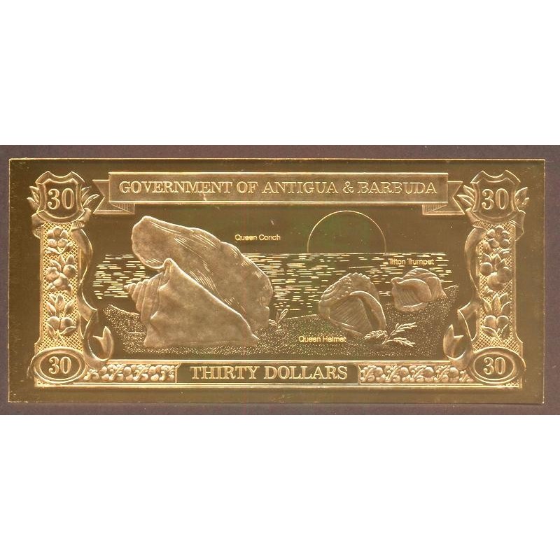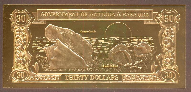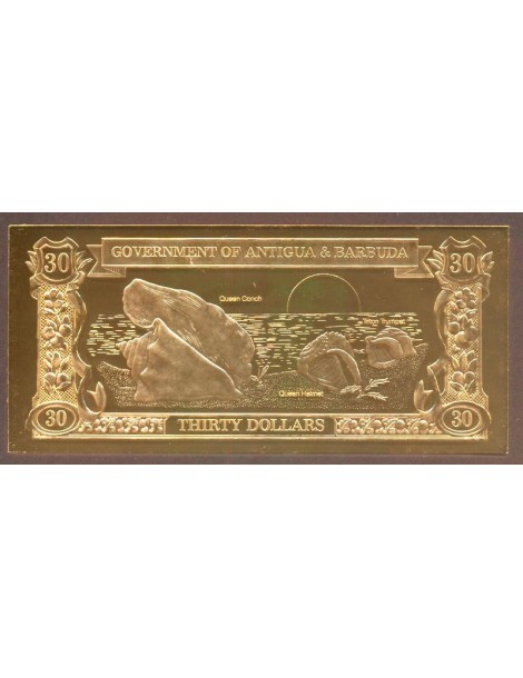 ANTIGUA & BARBUDA 30 Dollars 1983 Gold Foil Queen Conch, Helmet Shell, Triton Trumpet