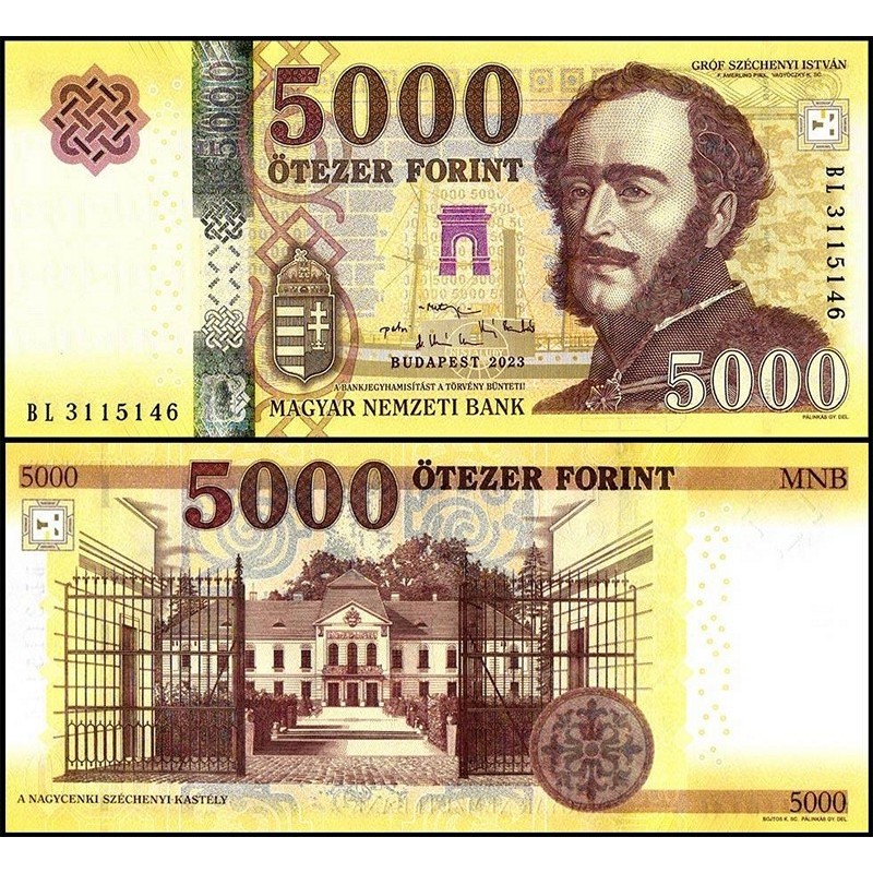 La scritta “ÖTEZER FORINT” e il valore “5000” compaiono in grande nella parte superiore.