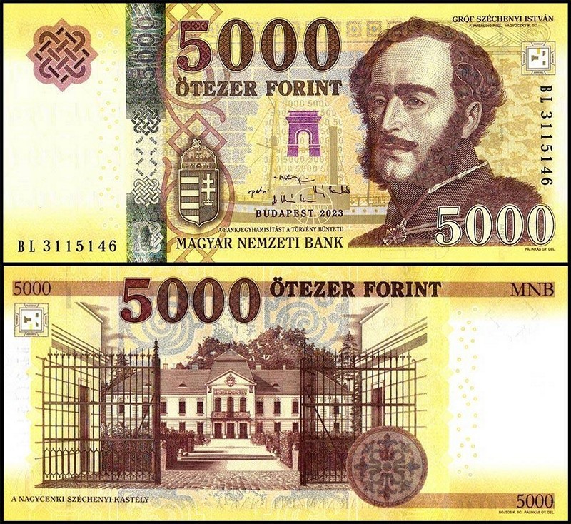 Sul lato destro è raffigurato István Széchenyi, importante statista e riformatore ungherese dell’Ottocento, con abbigliamento formale e basette caratteristiche.