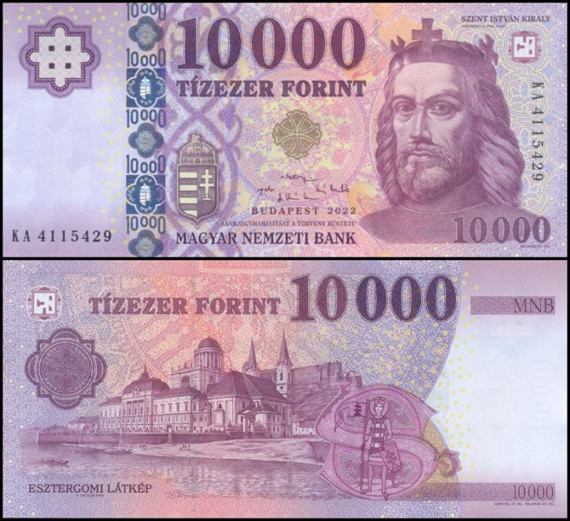 Il fronte presenta il ritratto di Szent István király (Re Stefano I d’Ungheria), figura cardine nella formazione dello Stato ungherese. Accanto al ritratto compaiono simboli araldici nazionali e motivi ornamentali di tradizione medievale.