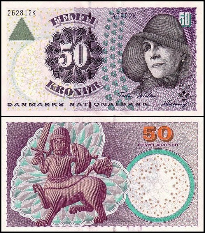 Il fronte presenta il ritratto di Karen Blixen, celebre scrittrice danese, raffigurata con un’impostazione formale che ne valorizza il ruolo culturale e letterario. La composizione integra elementi decorativi che accompagnano armoniosamente il soggetto principale.