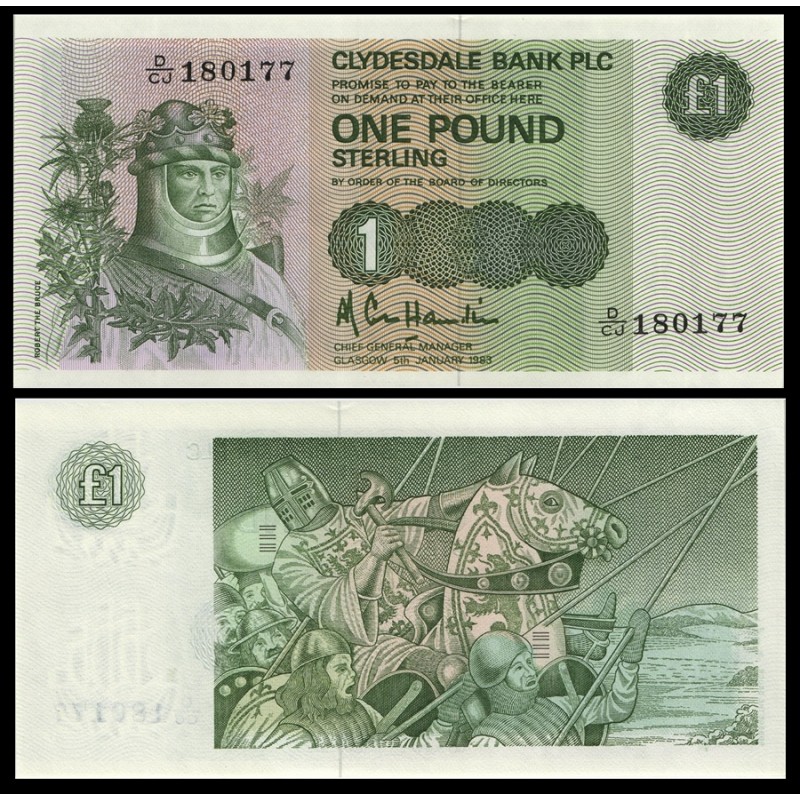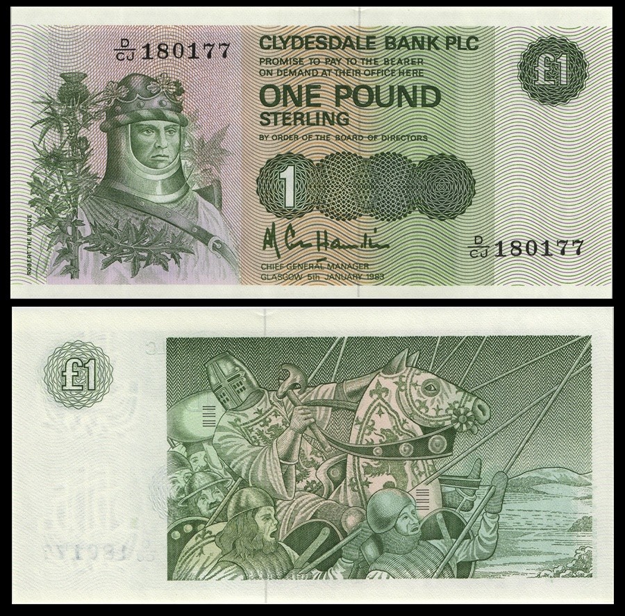 Il fronte presenta il ritratto di Robert the Bruce, re di Scozia e figura centrale nella conquista dell’indipendenza scozzese. La composizione, impostata in stile formale, mette in risalto il suo ruolo politico e simbolico nella storia nazionale.