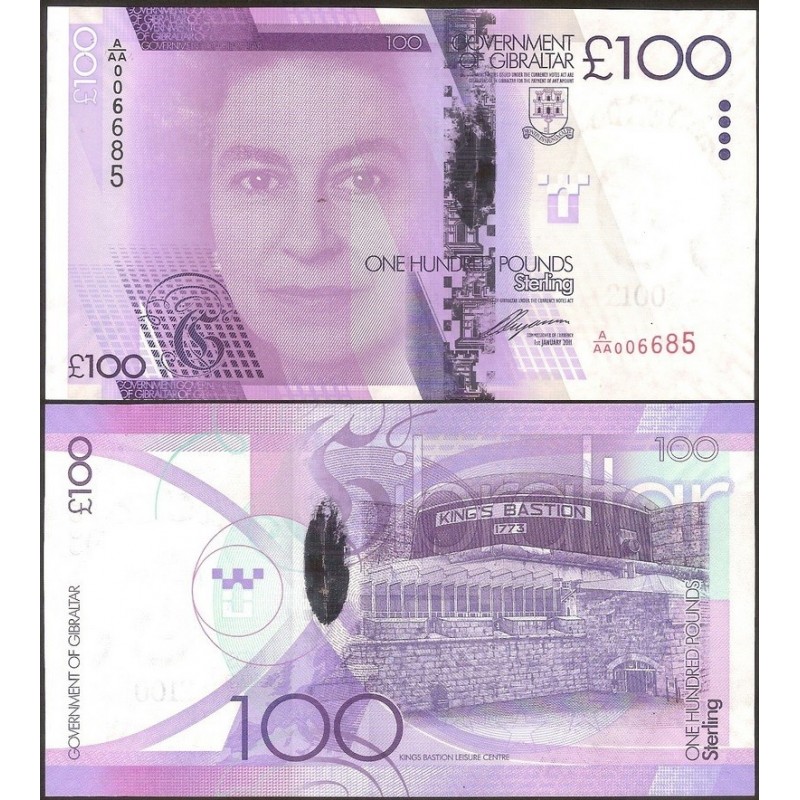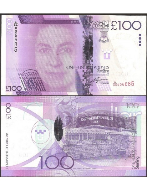 Ritratto della Regina Elisabetta II, con lo stemma di Gibilterra, il valore “100” e elementi grafici di sicurezza della banconota polimerica.