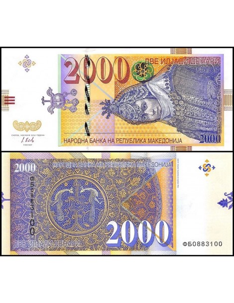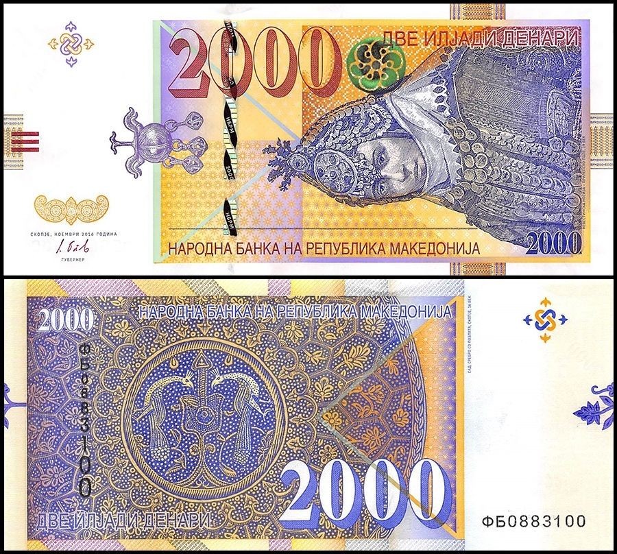 A destra compare una donna in abito tradizionale da sposa macedone (regione di Prilep), rappresentata con ricchi dettagli del costume folkloristico.