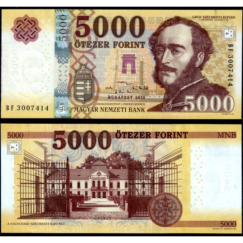La scritta “ÖTEZER FORINT” e il valore “5000” compaiono in grande nella parte superiore.