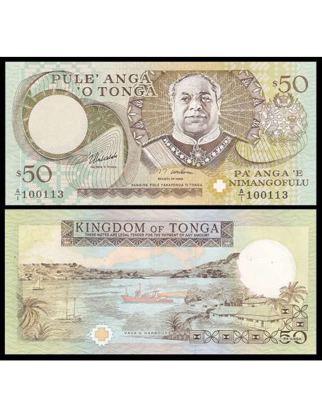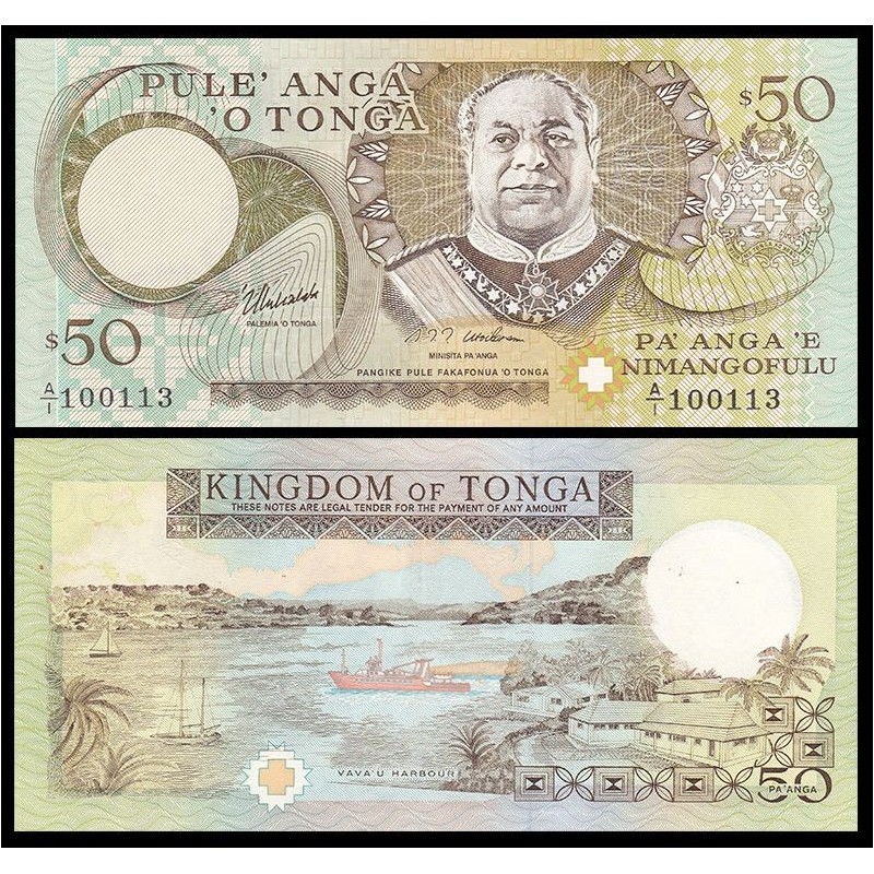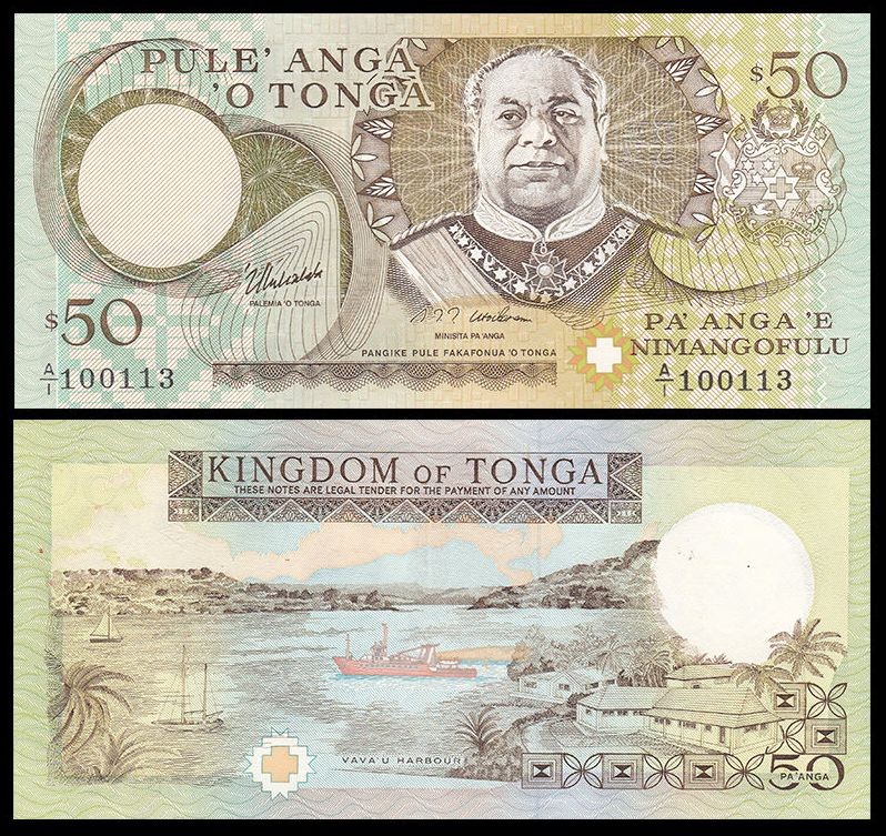 Ritratto di Re Taufaʻahau Tupou IV in uniforme cerimoniale, con stemma nazionale tongano e motivi decorativi tradizionali.