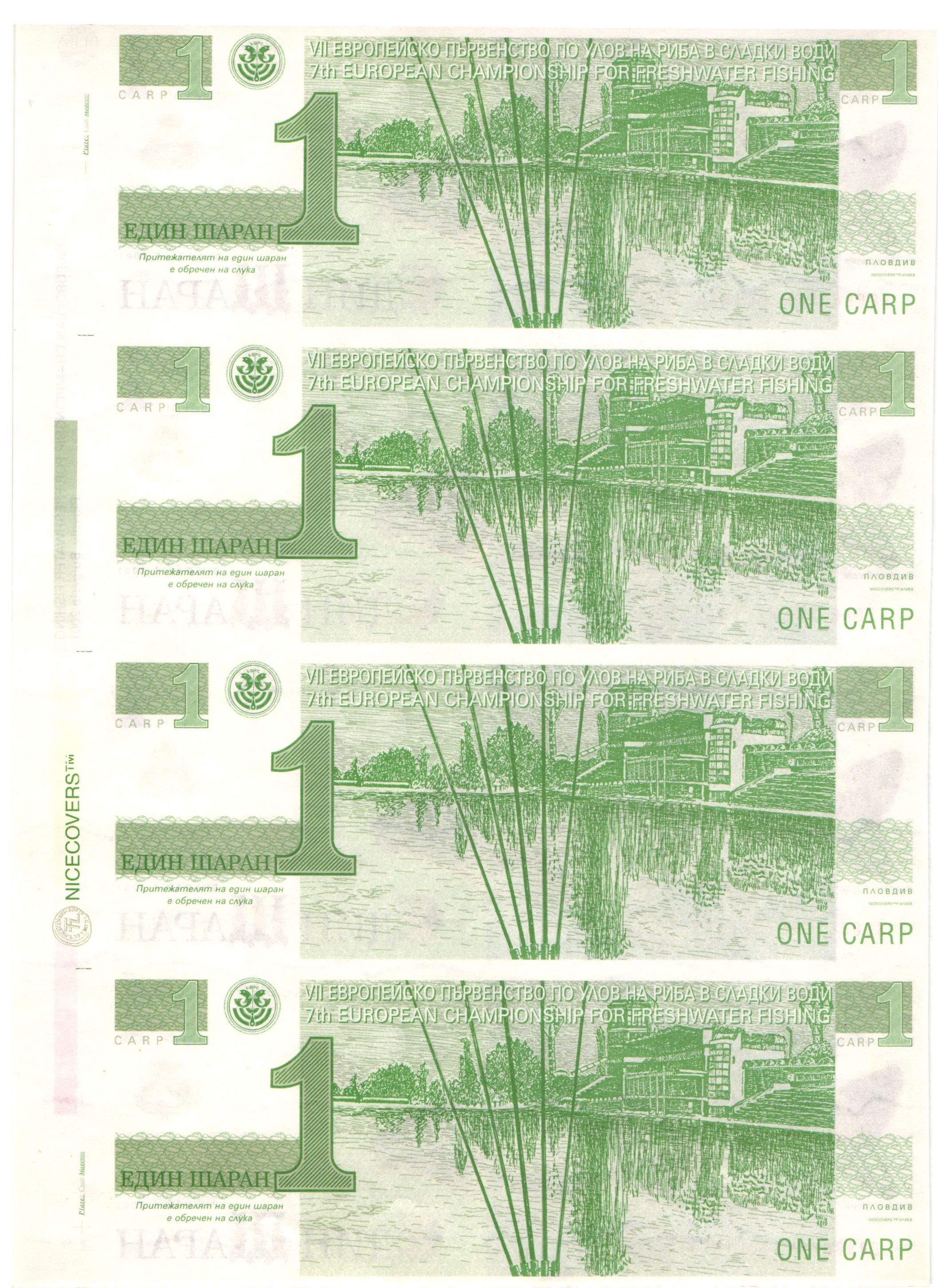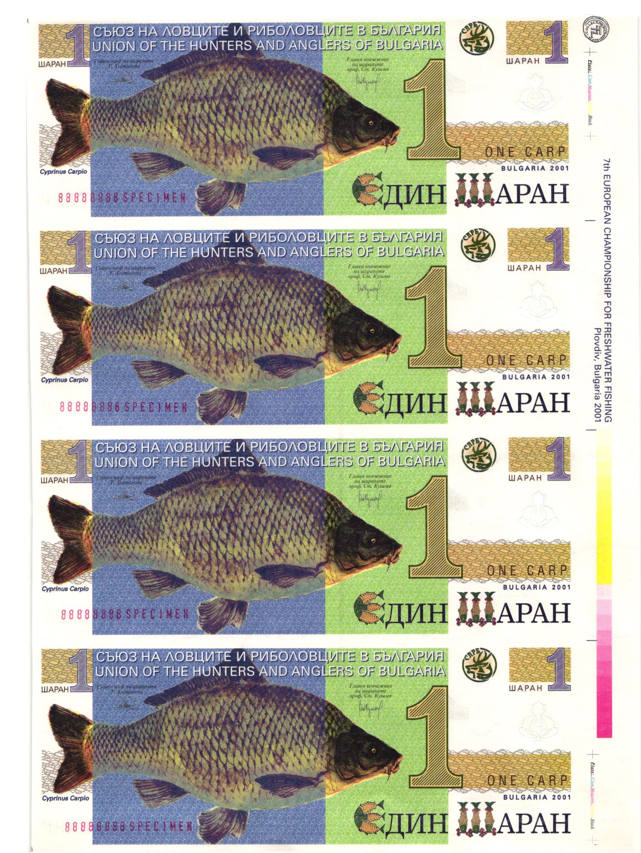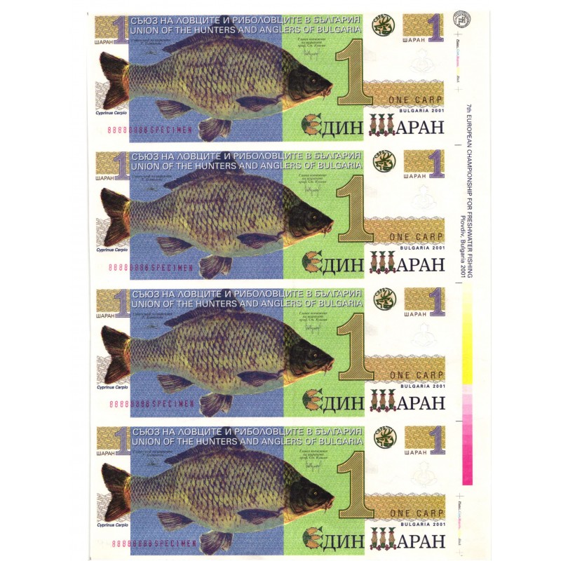 BULGARIA 1 Carp 2001 PRIVATE ISSUE "Hunters and Anglers" SPECIMEN - Uncut sheet of 4