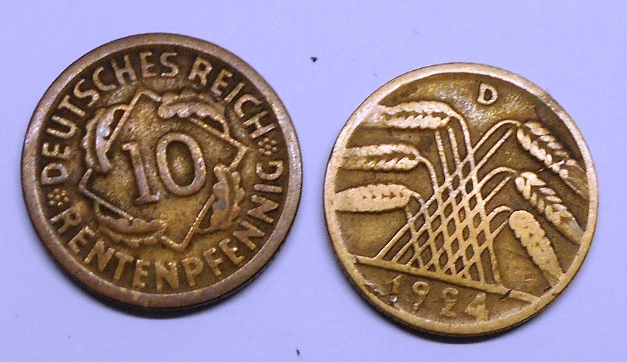 GERMANY WEIMAR REPUBLIC 10 Rentenpfennig 1924 D