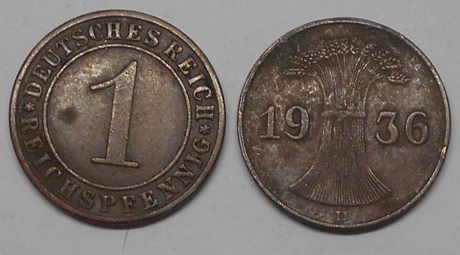 GERMANY WEIMAR REPUBLIC 1 Reichspfennig 1936 D