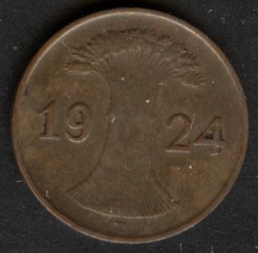 GERMANY WEIMAR REPUBLIC 1 Reichspfennig 1924 D