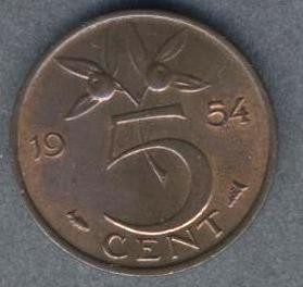 NETHERLANDS 5 Cents 1954