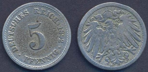 GERMANY EMPIRE 5 Pfennig 1892 A