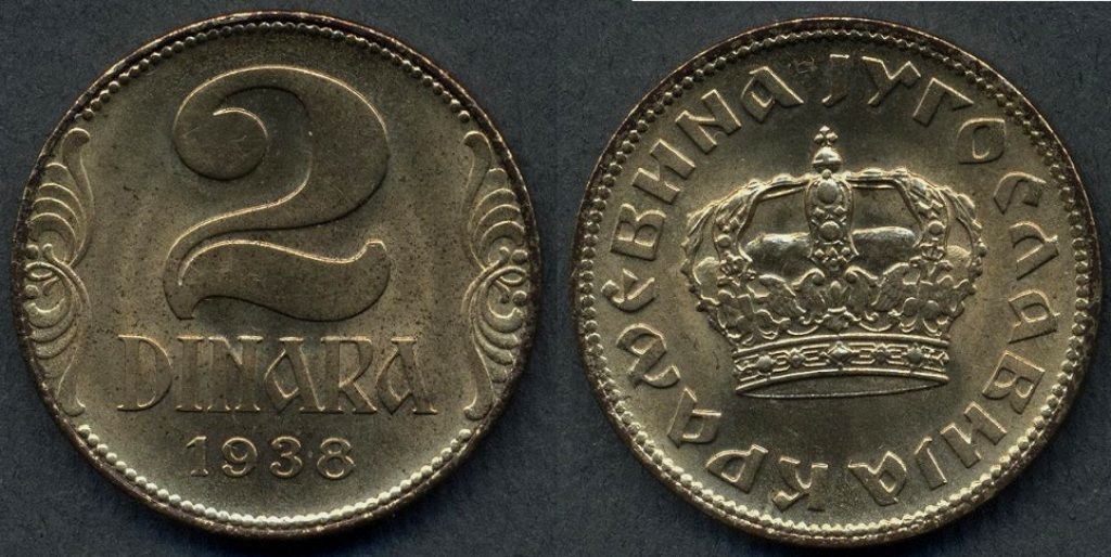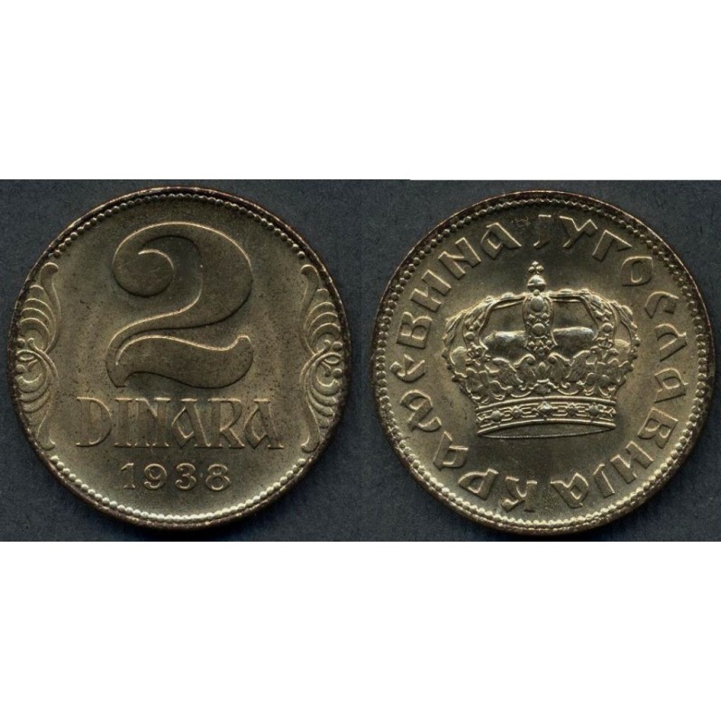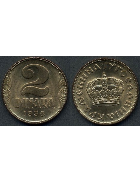 YUGOSLAVIA 2 Dinara 1938 large crown
