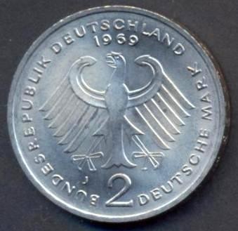 GERMANY FEDERAL REPUBLIC 2 MARK 1969 J K. Aderauur
