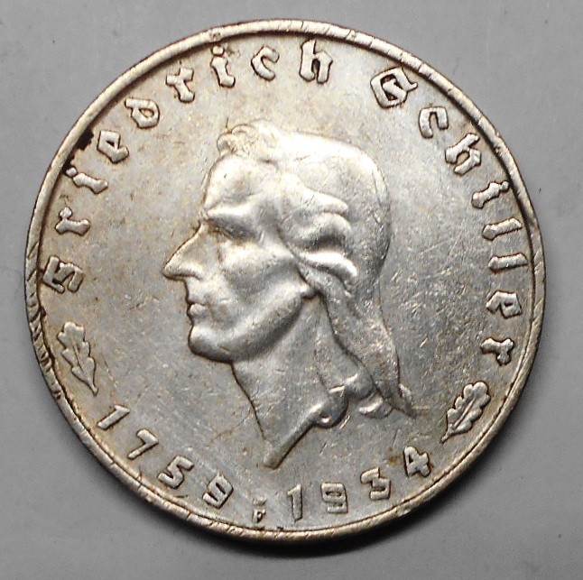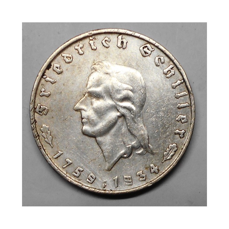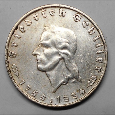 GERMANY THIRD REICH 2 Reichsmark 1934F -175th Anniversary Birth of Schiller AG
