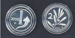 1 Lira + 2 Lire 2000 Proof Fondo Specchio